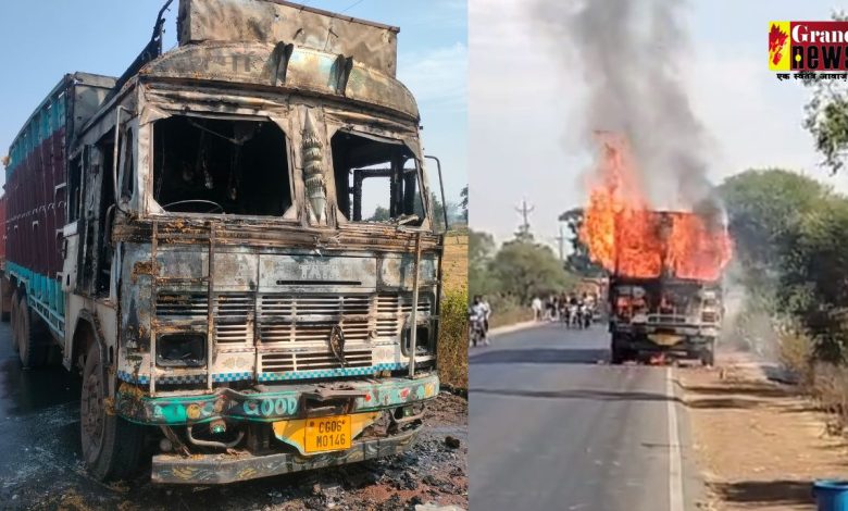 चावल से भरे ट्रक में लगी भीषण आग, फायर ब्रिगेड