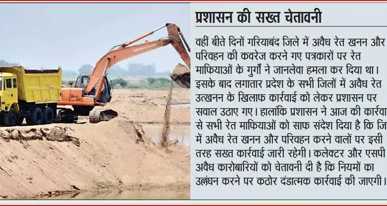 वहीं बीते दिनों गरियाबंद जिले में अवैध रेत खनन और परिवहन की कवरेज करने गए पत्रकारों पर रेत माफियाओं के गुर्गों ने जानलेवा हमला कर दिया था। इसके बाद लगातार प्रदेश के सभी जिलों में अवैध रेत उत्खनन के खिलाफ कार्रवाई को लेकर प्रशासन पर सवाल उठाए गए। हालांकि प्रशासन ने आज की कार्रवाई से सभी रेत माफियाओं को साफ संदेश दिया है कि जिले में अवैध रेत खनन और परिवहन करने वालों पर इसी तरह सख्त कार्रवाई जारी रहेगी। कलेक्टर और एसपी ने अवैध कारोबारियों को चेतावनी दी है कि नियमों का उल्लंघन करने पर कठोर दंडात्मक कार्रवाई की जाएगी।