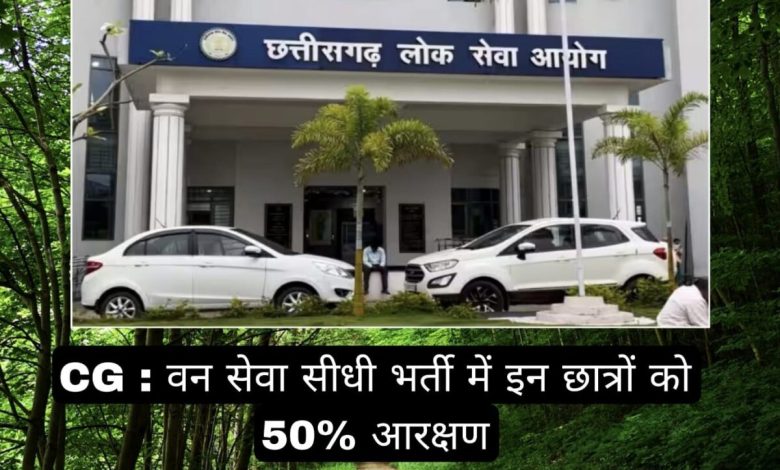 सहायक वन संरक्षक एवं वनक्षेत्रपाल की सीधी भर्ती के लिए रिक्त पदों के 50% पद वानिकी विषय के साथ मान्यता प्राप्त विश्वविद्यालय से स्नातक डिग्री प्राप्त अभ्यर्थियों के लिए आरक्षित रहेंगे। परंतु, यदि उक्त विषय के पात्र अभ्यर्थी उपलब्ध न हो तो उनके लिए आरक्षित पद अग्रनीत नहीं किए जायेंगे और विज्ञापित पदों की पूर्ति छत्तीसगढ़ वन (राजपत्रित) सेवा भर्ती नियम, 2015 में विहित शैक्षणिक अर्हता रखने वाले अन्य पात्र अभ्यर्थियों के द्वारा की जा सकेगी।”