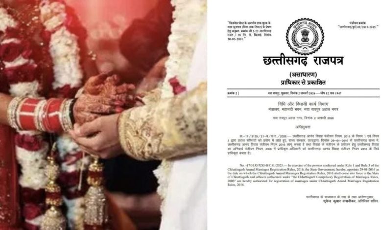 महानदी भवन, नवा रायपुर द्वारा जारी अधिसूचना के अनुसार, ‘छत्तीसगढ़ आनंद विवाह पंजीयन नियम, 2016’ की शक्तियों का प्रयोग करते हुए राज्य सरकार ने यह स्पष्ट किया है कि प्रदेश में अब विवाह का पंजीकरण कराना कानूनी रूप से जरूरी होगा।