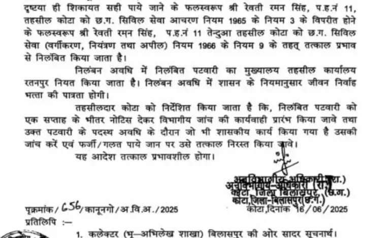 बिलासपुर. कोटा तहसील के ग्राम तेन्दुआ में पदस्थ पटवारी रेवती रमन सिंह को शासकीय भूमि के अवैध तरीके से विक्रय में शामिल होने के आरोप में तत्काल प्रभाव से निलंबित कर दिया गया है. यह कार्रवाई अनुविभागीय अधिकारी (रा.) कोटा, जिला बिलासपुर द्वारा की गई है.