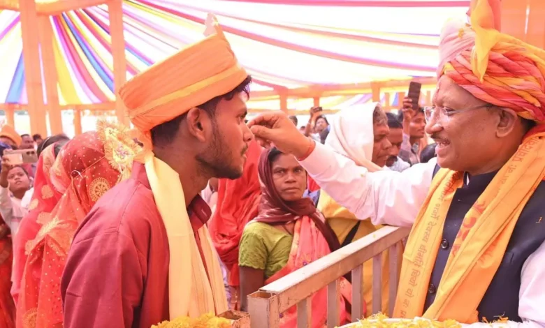 Raipur. रायपुर। मुख्यमंत्री विष्णु देव साय ने आज जशपुर जिले में कुनकुरी विकासखंड के सलियाटोली स्थित मिनी स्टेडियम में स्व. कुमार दिलीप सिंह जूदेव की स्मृति में आयोजित सामूहिक विवाह कार्यक्रम में शामिल होकर 353 नवविवाहित जोड़ों को आशीर्वाद दिया। मुख्यमंत्री श्री साय ने वैदिक रीति-रिवाज से विवाह मंडप की अर्चना करते हुए कार्यक्रम का शुभारंभ किया और प्रत्येक जोड़े को उपहार भेंट कर सुखी दांपत्य जीवन का आशीर्वाद दिया।