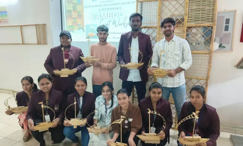 जिससे सुंदर और टिकाऊ उत्पाद बनाए जा सकते हैं। इस कार्यशाला से छात्रों को प्राकृतिक संसाधनों के उपयोग की प्रेरणा मिली और उन्होंने नई डिज़ाइन तकनीकों को सीखा, जो उनके भविष्य के लिए बहुत उपयोगी होगा।” मैट्स यूनिवर्सिटी के चांसलर गजराज पगारिया, प्रो वाइस चांसलर डॉ. दीपिका ढांड,वाइस चांसलर प्रोफेसर डॉ. के.पी. यादव , डी.जी. प्रीयेश पगारिया, और रजिस्ट्रार गोकुलानंद पांडा ने छात्रों के कार्यों की सराहना की और उन्हें पारंपरिक शिल्प को आधुनिक डिज़ाइन में शामिल करने के लिए प्रेरित किया। यह कार्यशाला इंटीरियर और फैशन डिज़ाइन के क्षेत्र में सम्पूर्ण विकास और नई क्रिएटिविटी को बढ़ावा देने की दिशा में एक महत्वपूर्ण कदम साबित हुई। इससे न केवल छात्रों का कौशल निखरा, बल्कि बांस जैसे पारंपरिक और पर्यावरण-अनुकूल संसाधनों एवं हेंडीक्राफ्ट के महत्व के प्रति भी जागरूकता बढ़ी।