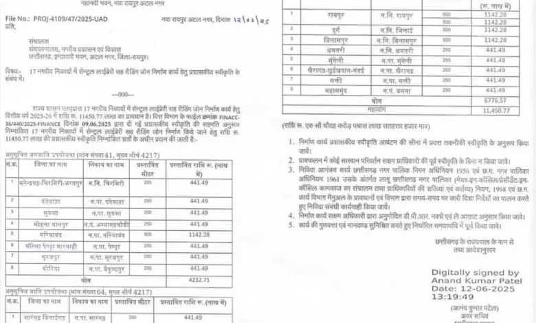 तैयारी के लिए अच्छा माहौल मिलेगा। साथ ही उच्च शिक्षा और प्रतियोगी परीक्षाओं के लिए अच्छी पुस्तकें भी मिलेंगी। प्रदेश के हर वर्ग के युवाओं के करियर निर्माण में ये सेंट्रल लाइब्रेरी-सह-रीडिंग जोन काफी सहायक होंगी। उप मुख्यमंत्री तथा नगरीय प्रशासन एवं विकास मंत्री अरुण साव के अनुमोदन के बाद विभाग ने मंत्रालय से विभागीय संचालक को सेंट्रल लाइब्रेरीज के लिए राशि की मंजूरी के संबंध में परिपत्र जारी किया है।