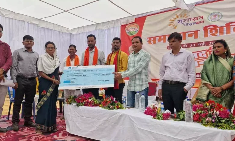 और क्लस्टर के सदस्य ग्रामों के जनप्रतिनिधियों के साथ बड़ी संख्या में ग्रामीण शामिल हुए। इस शिविर के माध्यम से सुशासन तिहार के प्रथम चरण में प्राप्त 4800 आवेदनों का निराकरण विभागों द्वारा किया गया। जिसमें प्रधानमंत्री आवास योजना के 1600 से ज्यादा आवेदनों पर सर्वे कार्य पूर्ण किया गया है। राजस्व विभाग द्वारा 140 आवेदन नामांतरण, बंटवारा और सीमांकन के निराकृत किये गये। इस अवसर पर कृषि विभाग द्वारा 18 किसानों को केसीसी वितरित कराया। इस दौरान 5वीं, 8वीं, 10वीं, 12वीं की परीक्षा में उत्कृष्ट प्रदर्शन करने वाले छात्रों को सम्मानित भी किया गया। शिविर में स्वास्थ्य विभाग के माध्यम से स्वास्थ्य जांच शिविर और मोबाइल मेडिकल यूनिट के माध्यम से लोगों ने अपने स्वास्थ्य की जाँच कराई।पंचायत द्वारा 02 हितग्राहियों को ट्राई साइकिल भी वितरित किया गया। इस कार्यक्रम में एसडीएम अमित श्रीवास्तव, तहसीलदार एवं सीईओ जनपद पंचायत भी उपस्थित रहे। इसी तरह कुनकुरी विकासखण्ड के ग्राम सेन्द्रीमुण्डा में आयोजित समाधान शिविर में उपाध्यक्ष जनपद पंचायत बालेश्वर यादव, जनपद सदस्य संजय कुमार लंग, शोभा देवी, जनप्रतिनिधि उपेंद्र यादव, संतोष सहाय, उमेश यादव सहित एसडीएम नंद जी पांडे, जनपद सीईओ कुमार प्रमोद सिंह, असीम टोप्पो सहित क्लस्टर के सदस्य ग्रामों के जनप्रतिनिधि एवं बड़ी संख्या में ग्रामीण शामिल हुए। इस शिविर के माध्यम से सुशासन तिहार के प्रथम चरण में प्राप्त 169 आवेदनों एवं उनके निराकरण को सभी के साथ साझा किया गया। इस अवसर पर जनप्रतिनिधियों ने 12