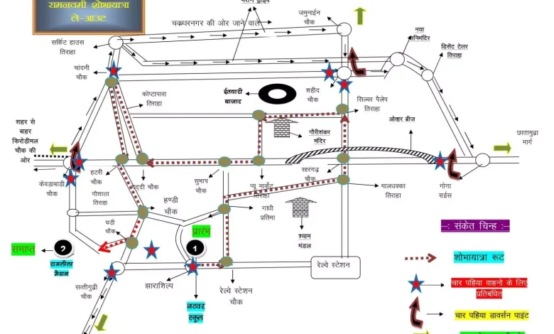 Raigarh. रायगढ़। शहर में शोभायात्रा के आयोजन को लेकर प्रशासन ने यातायात व्यवस्था में बदलाव करते हुए ट्रैफिक डायवर्जन लागू किया है। नटवर स्कूल प्रांगण से प्रारंभ होकर यह शोभायात्रा रामलीला मैदान तक विभिन्न प्रमुख चौकों से होकर गुजरेगी। इसके चलते शहर के कई इलाकों में चार पहिया वाहनों की आवाजाही पर पूर्ण प्रतिबंध लगाया गया है।
