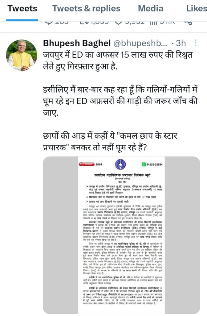 सीएम भूपेश बघेल ने ट्वीट कर हा, जयपुर में ईडी के अफसर रिश्वत लेते गिरफ्तार हुआ है, इसीलिए मैं बार-बार कह रहा हूं कि गलियों-गलियों में घूम रहे इन ED अफसरों की गाड़ी की जरूर जांच की जाए. सीएम बघेल ने कहा कि छापों की आड़ में कहीं ये “कमल छाप के स्टार प्रचारक” बनकर तो नहीं घूम रहे हैं?