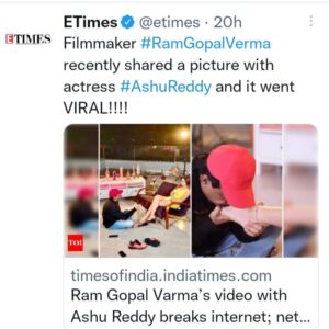 डायरेक्टर ने इस वीडियो का एक फोटो अपने ट्विटर अकाउंट पर भी खुद शेयर किया था. रामू ने फोटो शेयर कर लिखा था कि आशू रेड्डी में डेंजरस मार्क कहां है, फुल वीडियो 30 मिनट में 9:30 पर. इस फोटो में राम एक्ट्रेस के पैर को अपने हाथों में लिए जमीन पर बैठे हैं. और साइको लुक में कैमरा की तरफ देखकर पोज दे रहे है।