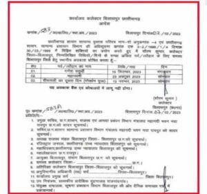 दरअसल, 2023 के लिए बिलासपुर जिले में कलेक्टर सौरभ कुमार ने स्थानीय अवकाश घोषित कर दिये हैं। इस साल अलग-अलग त्योहार पर स्थानीय अवकाश को लेकर लिस्ट जारी हुई है। जारी आदेश के मुताबिक गणेश चतुर्थी 19 सितम्बर 2023 दिन मंगलवार, दशहरा 23 अक्टूबर 2023 दिन बुधवार, गोवर्धन पूजा (दीपावली के दूसरे दिन) 13 नवम्बर 2023 दिन मंगलवार को स्थानीय अवकाश रहेगा। बिलासपुर की तरफ अलग अलग जिलों के कलेक्टरों द्वारा भी कर्मचारियों के लिए अवकाश घोषित किए गए है।