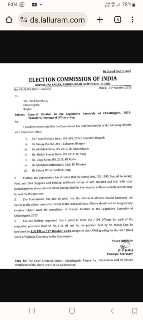 IAS , IPS ट्रांसफर, 3 SP, 2 कलेक्टर निर्वाचन आयोग ने हटाए