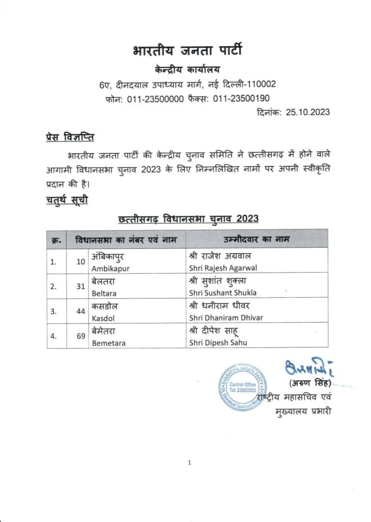 छग भाजपा की शेष 4 प्रत्याशियों का ऐलान, बेमेतरा से दीपेश साहू होंगे उम्मीदवार