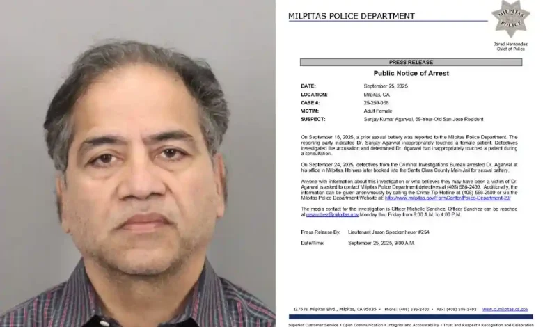 On September 16, 2025, a prior sexual battery was reported to the Milpitas Police Department. The reporting party indicated Dr. Sanjay Agarwal inappropriately touched a female patient. Detectives investigated the accusation and determined Dr. Agarwal had… pic.twitter.com/ckJU4i2Lsm