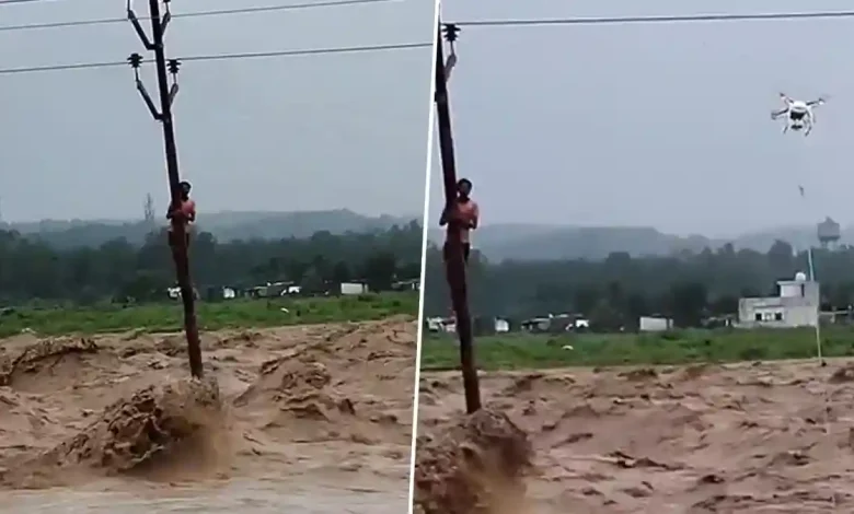 A man is stranded on an electric pole in the flooded Tons River near Sudhowala, Dehradun. Rescue operations are currently underway.